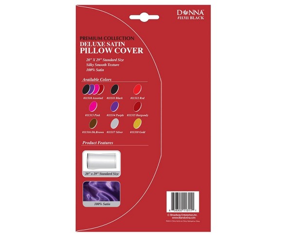 Description Enjoy a blissful night's sleep without disturbing your hair with the Donna Deluxe Satin Pillow Cover. Smooth and sleek to the touch, the satin pillow cover will protect your hair while you're having sweet dreams. Since sleeping on satin eliminate the friction you get when your hair rubs against a harsher fabric, this satin pillowcase helps smooth frizzy hair and minimizes static.Number of Pieces: 1Dimensions (Overall): 20 inches (L) x 29 inches (W)Textile Material: 100% MicrofiberPillowcase Features: Zipper ClosurePattern: Solid, no pattern appliedTextile construction: SatinThread Count: 200Care and Cleaning: Hand wash & Line dry or lay flat to dryKeep your hair smooth and unruffled with this exquisite pillow coverSatin finish is soft and sleek to the touchSatin pillowcase fits standard pillow size Estimated shipping dimensions: 4.8819INCH X 0.6299INCH X 8.8976INCH DPCI : 063-04-2949 UPC : 658302113111 TCIN : 50979142 Estimated shippimg weight: 0.1764POUND