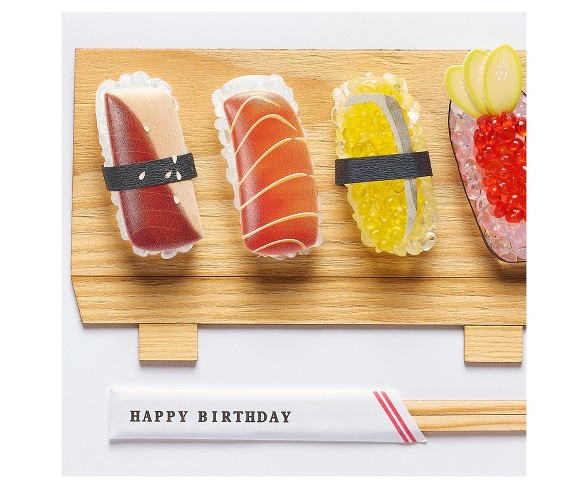Description A card that looks good enough to eat! Give the sushi lover the perfect birthday greeting with this handmade Papyrus card crafted from wood, paper and other materials for a fun, dimensional look. This unique 5 x 7" design is finished with an insert sheet with red foil greeting. Comes with a coordinating red envelope with black pearl liner, gold Papyrus hummingbird seal and a protective cello sleeve.Number of Pieces: 1Dimensions (Overall): 7.25 inches (L) x 5.25 inches (W)Decorative Accents: EmbellishmentPaper Type: CardstockInside Message: ENJOY and have a happy birthdayHandmade, wood, sculpted paper5 x 7Extra postage may be required Estimated shipping dimensions: 5.25INCH X 0.2INCH X 7.25INCH DPCI : 053-07-0715 UPC : 490530707157 TCIN : 52585154 Estimated shippimg weight: 0.1POUND
