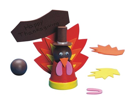 Description Foam turkeys craft kit contains paper cup flower "Pots", red, yellow and orange foam, feathers, brown hats, brown wooden heads, wiggly eyes, brown signs, purple gobblers, orange beaks and glue dots. Craft EXpress Foam turkeys craft kit has a dimension of 5" X 5" and can be assembled in 45 min. Craft kit is best suited for kids above 8 years age and improves creative thinking in them, sold as 12 per pack. Theme/design: Foam turkeys Size: 5" x 5" Ages: 8 years and up Project/assembly time: 45 min It's as easy as pie to assemble these gobblers from mini painted paper cups Wooden balls and precut foam shapes Includes paper cup flower "Pots", red, yellow and orange foam, feathers, brown hats, brown wooden heads, wiggly eyes, brown signs, purple gobblers, orange beaks and glue dots Warning: Chocking hazard small parts, not for children under 3 yrs Environmentally friendly recycled product. Contains 10% Post Consumer content. Specifications Color Family : Yellow Craft Kits & Accessory Type : Animal Themed Kits True Color : Yellow Craft Kit & Accessory Number of Pieces : 12+ Brand : Craft Express Customizable : No Weight : 9.02 lbs. per Pack
