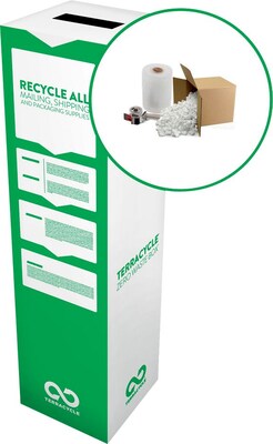 Description Use this box to recycle any material used for packing and transporting products bel which is already affixed to your box. When we receive your box, we'll safely recycle all of the collected materials. Recycle any material used for packing and transporting goods. Processing: The collected waste is mechanically and/or manually separated into fibers, and plastics. The fibers (such as paper or wood based products) are recycled or composted. The plastics undergo extrusion and pelletization to be molded into new recycl Accepted Waste: Please send us your used shipping materials such as stretch wrap, bubble wrap, packing foam, shipping peanuts, bubble wrap, air cushions and tape dispensers. Unaccepted Waste: Please do not include any corrugated cardboard that can be municipally recycled. We will also not accept household hazardous waste such as pressurized canisters, pesticides, oil based paint or medical sharps, organics, broken glass, bio- How it Works: Please choose the size box you'd like to purchase. When you receive your box fill it with the appropriate waste streams. Once full, bring your box to any UPS location to ship your items back to TerraCycle using the pre-paid UPS shipping labe Specifications Receptacle Shape : Rectangular Capacity in Gallons : 22 Brand : TerraCycle Customizable : No Weight : 2.80 lbs. per Each