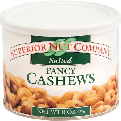Description Pop open one of these cans of Superior Nut Whole Cashews, 8 oz, 12 Count and enjoy the rich, crunchy flavor of natural whole cashews. High in Calcium and Iron, and an excellent source of Fiber, these cashews are packed with nutrients, protein, and flavor! Great for office snacking and for any snack bowl, these crunchy nuts are the perfect pick-me-up snack. Superior Nut Whole Cashews, 8 oz, 12 Count is great for any office, home or breakroom. Grab a handful and crunch your way through the great, natural flavor! 12 8-Ounce Cans of delicious Superior Nut Whole Cashews Resealable Cans of Whole Cashews Perfect for office snacking! Specifications Snack & Meal Type : Cashews Nut Free : No Brand : SUPERIOR NUT COMPANY Customizable : No Weight : 7.00 lbs. per Each