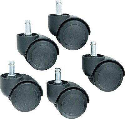 Description Master Caster® Safety Caster provides an internal brake that prevents wheels from rolling freely when you stand up. It comes with an oversized neck, B stem, and soft wheel tread. Master Caster® Oversized neck safety caster has 2" Dia soft wheel that features an internal brake to avoid wheels from turning freely when user is seated. Caster can be K stem mounted and is made of matte black nylon material to offer durability. Matte Black Nylon Prevents wheels from turning freely when the user is seated Provides smooth rolling chair movement when no weight is applied Ideal for medical, drafting, factory and dental stools Full hoods Dimensions: 2 1/2"H Wheel Diameter: 2" Weight Capacity: 125 lbs. Soft wheels for use on hard floors and chairmats only For safe rolling on chairmats and all hard floor surfaces Lifetime mfr. warranty Rolls when you’re seated, brake keeps chair from rolling when you stand Ideal for hard surfaces and low pile carpeting where runaway chairs are a problem Dual 2" wheels, full hood Matte black finish Weight rated: 100lbs. per caster K stem, soft wheel tread Soft tread casters for use on chair mats and hard floor surfaces 2" full hood wheels with 100 lb load capacity per wheel Internal brake prevents wheels from rolling freely when user stands Euro-style design for chairs where leg and caster fit together to appear as one All casters should be replaced at the same time for safe, smooth rolling Specifications Warranty : Lifetime Limited Warranty Product Color Family : Black Weight (lbs.) : 1.4 Item Material : Nylon Pack Qty : 5 True Color : Black Height in Inches : 6.9 Width in Inches : 3.3 Depth in Inches : 1.4 Diameter-inches : 2 Chair Accessory Type : Casters Brand : Master Manufacturing Customizable : No Weight : 1.35 lbs. per Set