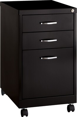Description Stay organized and get more out of your workspace with Space Solutions file cabinets. This Space Solutions rolling mobile pedestal file cabinet provides three drawers to hold a variety of office essentials. The top two drawers are ideal for supplies like paper, pencils, pens, and clips as well as small electronics, chargers, staplers, and more (organization tray sold separately). The file drawer is sized to accommodate letter-size hanging file folders and keep important documents organized and secure. To keep your files and items safe, a single lock mechanism secures all three drawers. Once unlocked, ball bearing slide suspension ensures the drawers will open and close smoothly and evenly. Built to last, this filing cabinet is constructed of strong, durable steel and contains 28% recycled content, making it a practical and eco-friendly choice. The cabinet doesn't skimp on style, either. The clean lines and finish looks sharp, and will complement any home or professional space. Assembly of handles and casters required, hardware included. Three drawer Box/Box/File mobile file cabinet ideal to store files and office supplies, accommodates letter-size hanging file folders Classic steel design features durable enamel finish in black Dimensions: 26."H x 15"W x 19"D Steel, ball-bearing drawer suspension Keyed lock for added security secures all drawers Three quarter drawer extension prevents tipping Tucks under most work surgaces with easy roll casters Assembly of handles and casters required, hardware included Specifications Weight (lbs.) : 34 Furnishing Color : Black Furnishing Material : Metal File Cabinet Type : Vertical File True Color : Black Height in Inches : 26 Width in Inches : 15 Series or Collection : Small Office Home Office Depth in Inches : 19 Drawer Glides : Roller Gide Suspensionl Lock Included : Lock Included Safety Features : Three-quarter drawer extension to prevent tipping File Cabinet Features : Mobile/Pedestal Meets ANSI or BIFMA standards : Yes Number of File Drawers : 1 File Size : Letter File Cabinet Assembly : Partial Assembly Required File Follower Included : Not Applicable File Frame Needed : No File Cabinet Usage : Home or Small Office Use Brand : Space Solutions Customizable : No Weight : 40.00 lbs. per Each