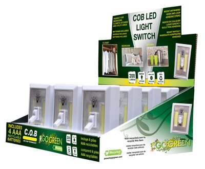 Description The GoGreen Power Switch Light LED Display is perfect for bedrooms, closets, kitchens, and utility areas. Mount anywhere with hook and loop adhesive strips included. Item contains 3 AAA batteries that are included. Color = White Batteries Included Perfect for bedrooms, closets, kitchens and utility areas Mount anywhere with hook and loop adhesive strips California Prop 65 Warning: This product contains chemicals known to the state of California to cause cancer and birth defects or other reproductive harms. Wash hands after handling the product. We have all thrown our items in the trash, even though it always says on the package dispose of properly. Everyone wants to recycle, but not change their lifestyle. We want to make it easy for you to recycle comfortably from your home or office. Its Free! Specifications Color : White Size : Medium Pack Qty : 12+ True Color : White Height in Inches : 1 Width in Inches : 2 Depth in Inches : 4 Lumens : 200 Flashlights & Lanterns Type : Flashlight Flashlights & Lanterns Bulb Type : COB LED Flashlights & Lanterns Battery Type : Alkaline Flashlights & Lanterns Body Material : Plastic Bulb Type : LED Body Material : Plastic Brand : Go Green Power Customizable : No Weight : 3.00 lbs. per Each