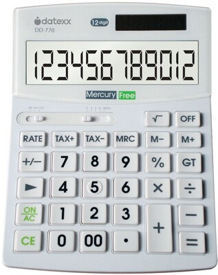 Description Oversized Keys and LCD angled display with plastic keys. With Mercury Free Battery backup. RoHS compliant. Hybrid Powered Desk Size Calculator Extra Large 12 digit LCD Display Extra Large Keypad for ease of operation Solar as the Main Power with Mercury Free Battery Backup Double the Life Cycle of regular Calculators Power Saver Auto Shut Off Feature in 7 Minutes when not in use Battery(s): 1 LR44 (included) Dimensions: 5.51x7.48x1.18 h (inches) Specifications Power Source : Battery, solar panel Color Family : White Type of Display : LCD Number of Digits Displayed : 12 Brand : Datexx Customizable : No Weight : 0.60 lbs. per Each