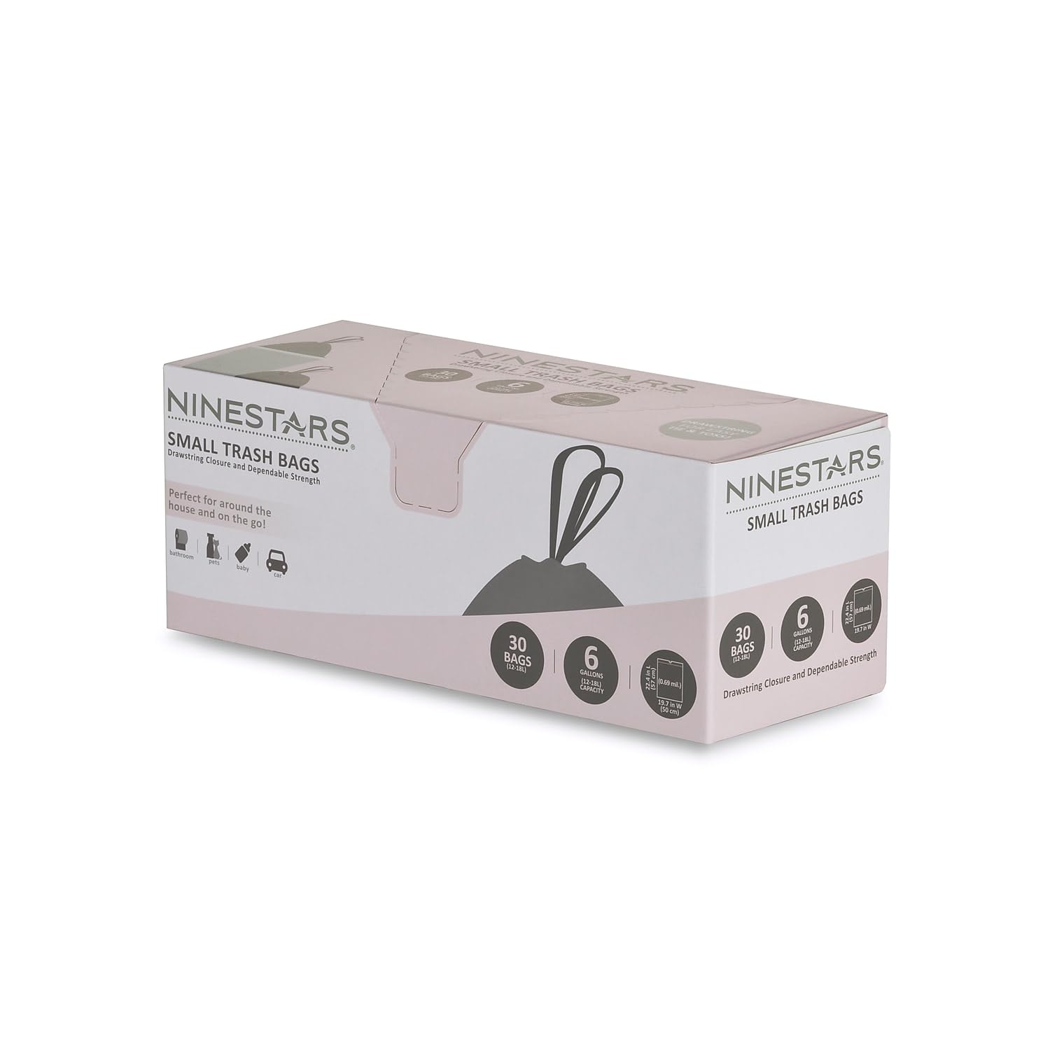 The Ninestars NSTB-6-30 Extra Strong White Trash Bags are designed for durability and convenience, featuring a leak-proof design and a drawstring closure for easy handling. With a generous capacity of 6 gallons and a bulk count of 30 bags, these trash bags are perfect for any household looking to manage waste efficiently while keeping odors at bay.