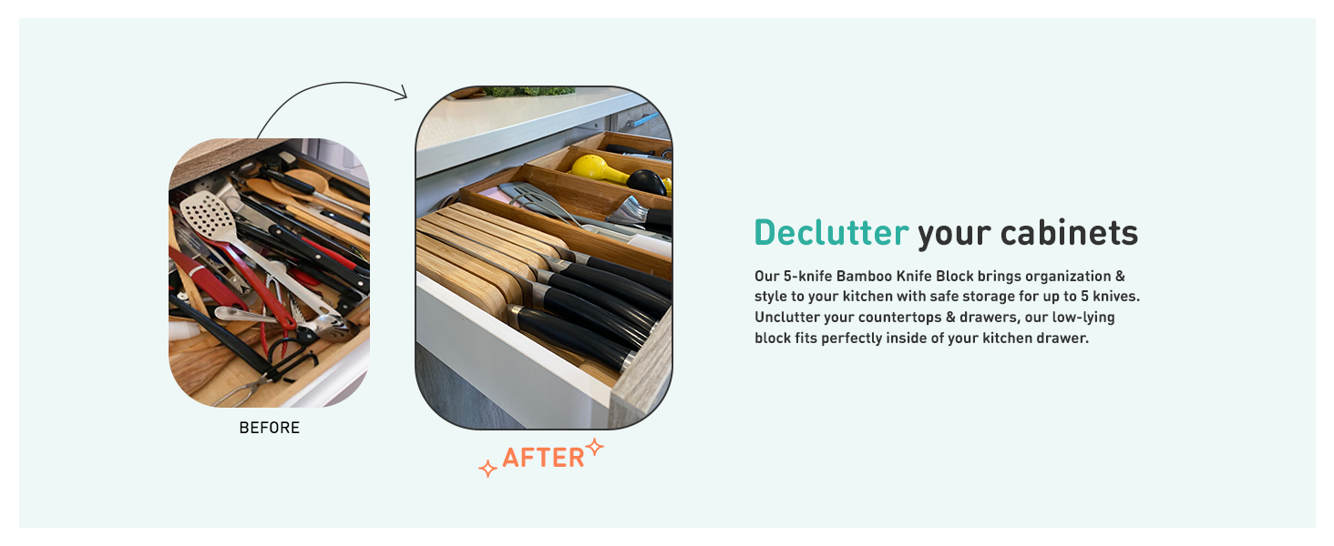 The Bamboo Knife Block and In-Drawer Storage is a stylish and sustainable solution for organizing your kitchen knives. Measuring 13.78 L x 5.4 W x 2.1 H inches, it holds up to five 8-inch knives, ensuring your countertops remain clutter-free while providing safe and elegant storage.