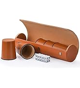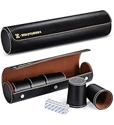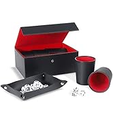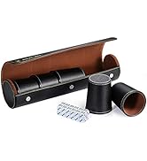 The ImnBest Leather Dice Cup Set includes 5 black PU leather dice cups with rounded corners and felt lining for quiet rolling, 25 standard 6-sided dice, and an exclusive faux leather magnetic closure case for easy storage and transport. Designed for durability and elegance, this patented set is perfect for professional and social gamers aged 14 and up, making every dice game a sleek, noise-free experience.