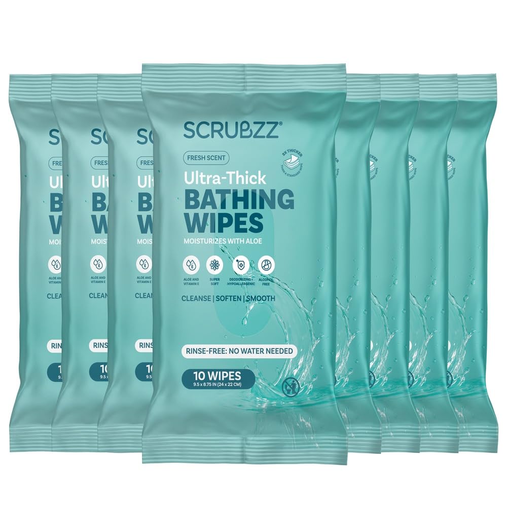 Scrubzz Extra Large Bath Wipes deliver 80 ultra-thick, 25% larger, premoistened wipes designed for adults needing convenient, water-free cleansing. Ideal for post-workout freshness, post-surgery care, camping, and elder hygiene, these hypoallergenic, rinse-free wipes combine premium comfort with practical versatility in travel-friendly sealed packs.