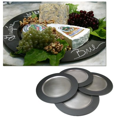 Chalkboard Chargers, set of 4These Chargers are not only great for plates but as appetizer and cheese platters. They are a fun and interesting way to personalize your entertaining. Simply grab a piece of chalk and write each guests name on the charger instead of a place card or write the names of the cheeses. Since each piece is completely hand-made, each one will have its own unique nuance, something that can only be obtained from the human hand and spirit. Plates are steel with a chalkboard lacquer. They measure 14"Diam. We recommend hand washing to preserve their unique coating.