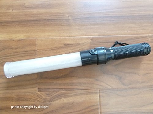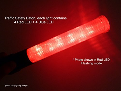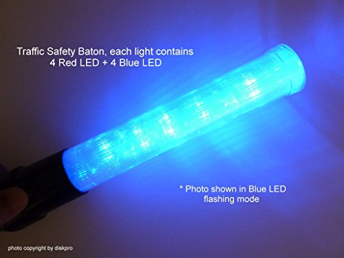 * Sold in one piece of Compact-sized 16.0 inch Traffic Safety wand with flashlight * Each Baton contains 4 Red and 4 Blue color LED (Light Emitting diodes), * Three Flashing Modes: Blinking (Red), Steady-Glow (Red), Steady-Glow (Blue) * Operated by Two (2) D-size Cell Batteries * * Dimensions: Handle in Black color - 8.0 inch length. Clear Lens in 8.0 inch. Total : 16.0 inch length x 1.75 inch diameter. * imports from China (Photo shown in one in Red, another one in Blue. Only one unit is sold.)