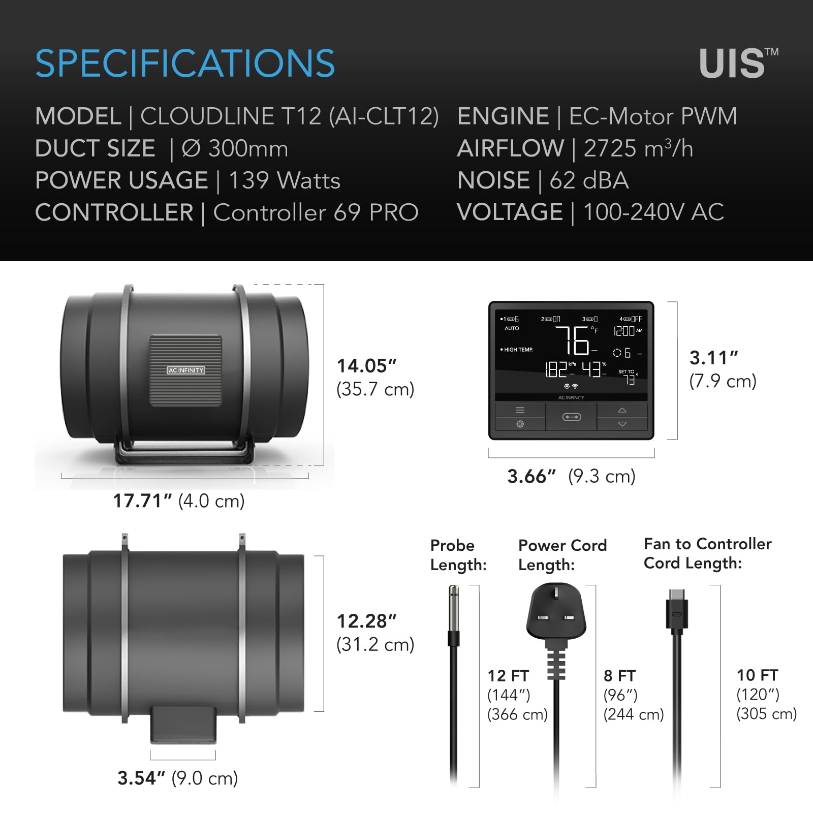 The AC Infinity CLOUDLINE PRO T12 is a 12-inch inline duct fan engineered for hydroponic grow rooms, AV closets, and climate-sensitive spaces. It features a powerful 1604 CFM airflow, ultra-quiet 62 dBA operation, and advanced temperature and humidity control via a WiFi-enabled app. Its mixed flow design and PWM-controlled EC motor deliver energy-efficient, whisper-quiet ventilation, while dual ball bearings ensure durability. Compatible with UK voltage and equipped with a Type-G plug, it’s the smart choice for professional-grade environmental control.