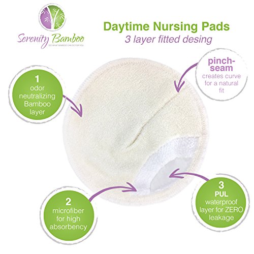 MORE BABY TIME, LESS TIME CHANGING SHIRTS New moms have so much to worry about, and leaky nursing pads should never be one of them. This pack of 8 reusable and high-quality organic bamboo nursing pads soothes nipples while providing unparalleled leakproof protection. SUPER SOFT AND EFFECTIVE The first layer of ultra soft bamboo rests against the nipple, and is followed by a layer of luxuriously absorbent bamboo material and finally one layer of waterproof PUL on the outside. Together, these layers make sure the milk gets absorbed and never dribbles out. SAFE AND LUXURIOUS Made of organic bamboo that is sustainably harvested, these nursing pads are hypoallergenic, BPA free and wonderful for sensitive-skinned moms. DURABLE AND MACHINE WASHABLE Toss these nursing pads in with the rest of your wash for easy cleaning. Each set comes with a colorful carrying pouch that you can wash them in too. ONE SIZE FITS ALL Each nursing pad is 10 cm diameter and slightly contoured to be one of the least noticeable on the market. Zero Leaks, Zero Mess, All comfort without the need for disposables DISAPPEARS UNDER CLOTHING With a white color and sleek design, these nursing pads will stay hidden while also keeping you and your shirts dry.