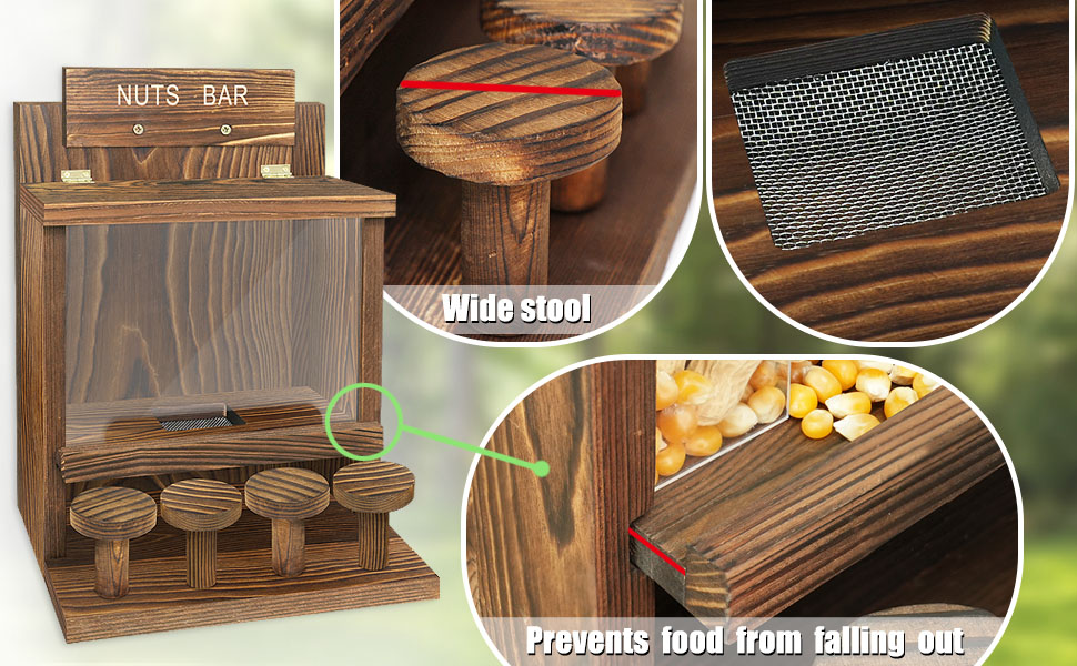 This large, durable squirrel feeder features a reinforced carbonized wooden design with an enlarged perch and leak-proof mesh to keep food dry. Its classic brown finish enhances outdoor decor while providing a secure, spacious feeding area that invites squirrels for a charming, interactive wildlife experience.