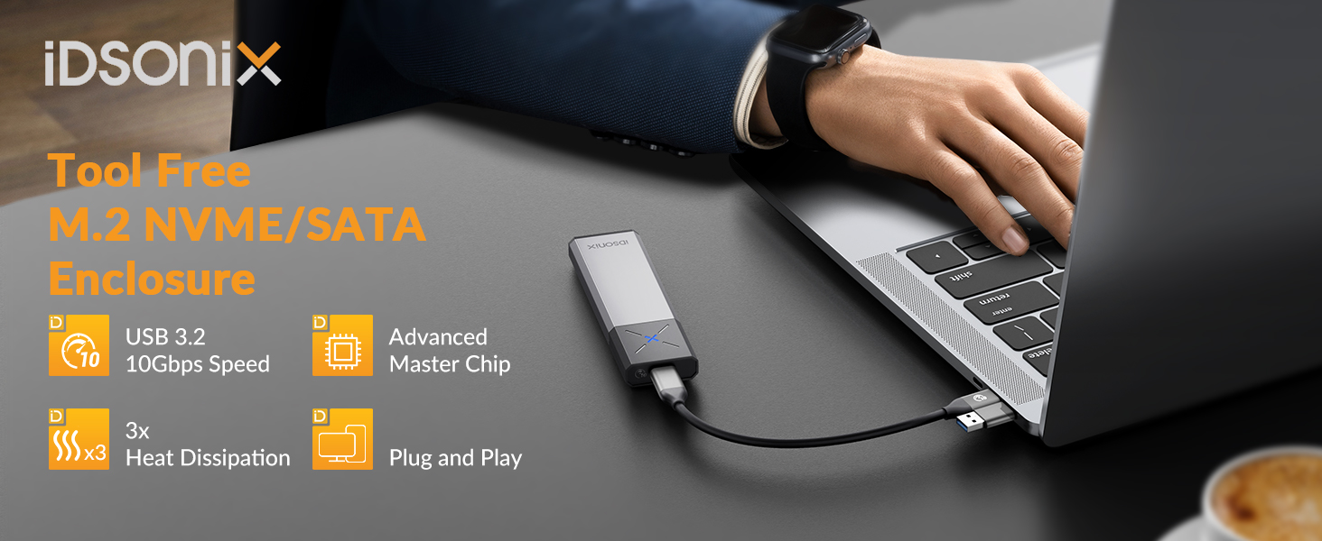 ![iDsonix M.2 [NVMe & SATA] SSD Enclosure Adapter[Tool Free][Aluminum], NVMe to USB 3.2 Gen 2 10Gbps, M.2 to USB C&A Supports M-Key/B+M Key, with UASP Trim for 2230/2242/2260/2280 SSD](https://m.media-amazon.com/images/I/71DA-vxlPML.jpg)