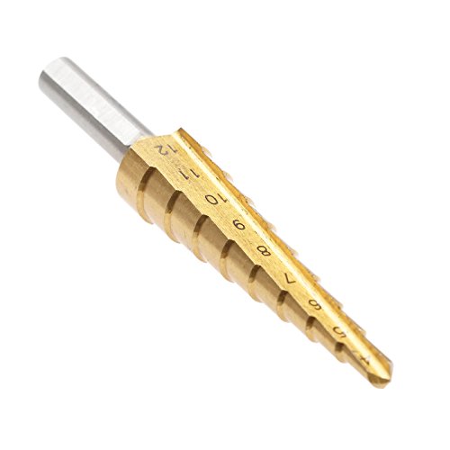 Specification: Material: HSS 6542 / M2 (used in hardness 28¡ãbelow the workpiece for, such as aluminum, stainless steel) Specification: 4-12mm x 5 step (4,6,8,10,12mm) Surface treatment: Titanium Color:Golden Package List: 1 x HSS Steel Sprial Step Cone Drill