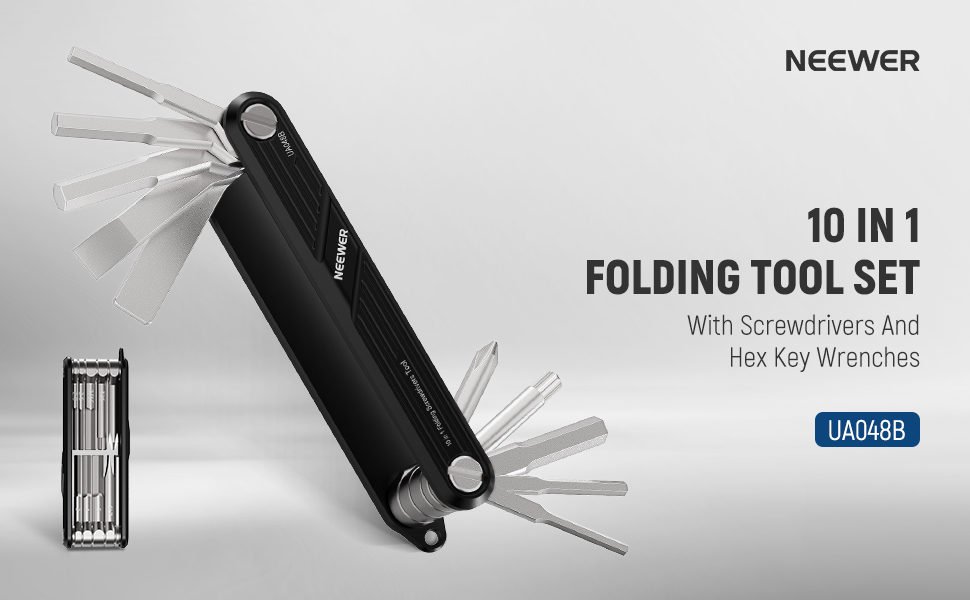 The NEEWER 10-in-1 Multifunctional Foldable Screwdriver Tool Set is a compact, lightweight, and durable toolkit designed specifically for camera professionals and enthusiasts. Featuring 4 screwdrivers and 6 hex keys compatible with SmallRig camera cages and tripods, it offers 360° adjustable fold-out tools for precise torque control. Crafted from anodized aluminum and stainless steel, this pocket-sized set ensures reliable, scratch-resistant performance and comes with a high-quality storage pouch for easy portability.