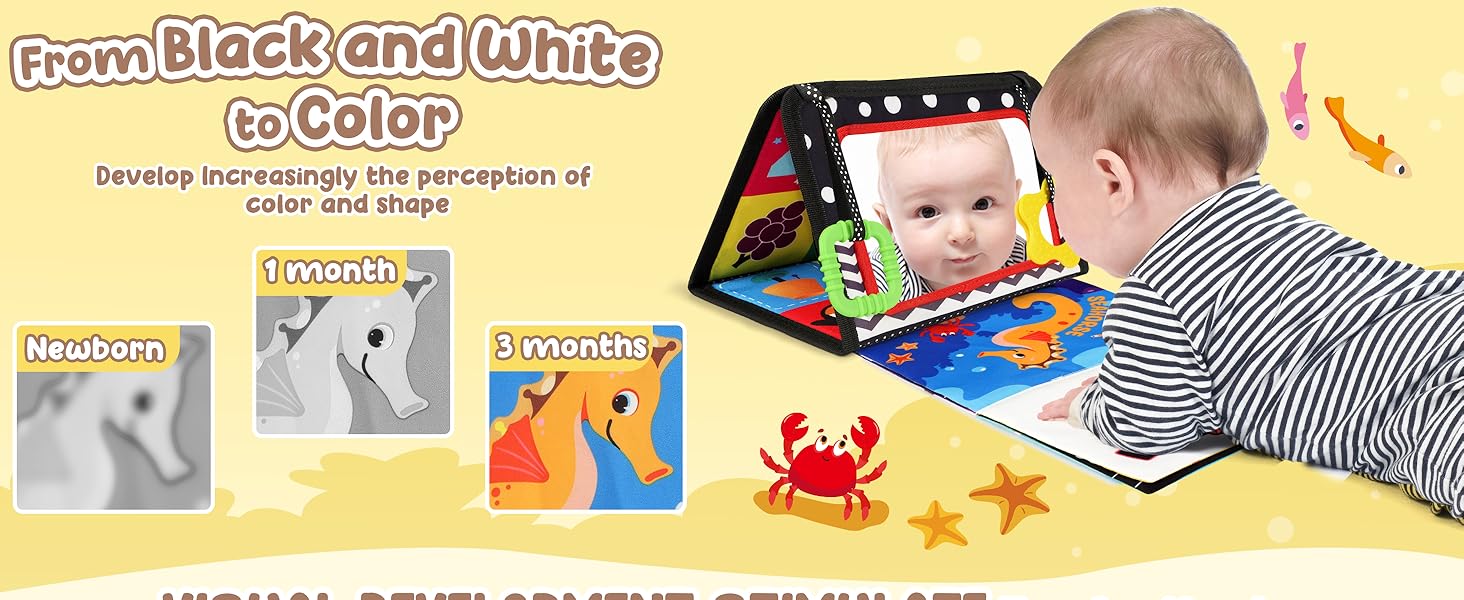 The URMYWOTummy Time Toy is a multi-sensory developmental tool designed for infants 0-12 months. Featuring high-contrast black and white patterns for newborn visual stimulation, 8 interactive crinkle paper sides for tactile exploration, and a safe flexible mirror to promote cognitive and self-recognition skills. Portable and versatile with tie straps for easy attachment, made from BPA-free, washable materials, making it a perfect gift for early childhood sensory and motor development.