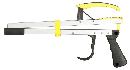 Only 8 oz. of pressure required at trigger to close jaws. Advantage: With less pressure required to overcome internal forces, less force is required to grasp, a real advantage for those impaired. Advanced ergonomic textured designed handle and trigger area. Advantage: Versatility in use with less operating force. Heel of hand and fingers are in a more natural position. On folding model, jaw can be rotated 90 and 180 degrees. Advantage: With the jaw rotated 90º, vertical objects can be grasped with hand, wrist and forearm in a completely natural position. Jaw has interlocking tips and color over molded tip. Advantage: Vastly improves grip force with clothing and other fabrics. Soft, slip-resistant Santoprene molding over claw provides greater grip power. Advantage: Ability to safely grasp larger and heavier objects more securely. Jaw opening of 3¼" grasps larger objects such as 15oz. cans. Advantage: D-Claw provides greater versatility in useage. Pulling post and magnet in the tip end of reacher. Advantage: Over 250% increase in pick up power. Folding model collapses flat. Advantage: More convenient placement in wheelchairs, walker