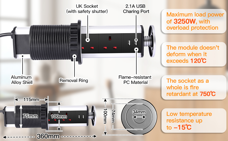 This Pop Up Socket features a sleek pull-up design with 3 UK power outlets and 2 USB charging ports, housed in a durable aluminum alloy and flame-resistant plastic shell. It includes built-in safety features like a fuse and child-proof shutters, supports up to 3250W, and installs easily into countertops with an 80mm cutout—ideal for modern home, office, or kitchen environments.
