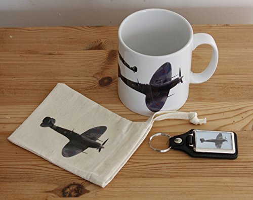 This gift set consists of an 8cm diameter by 9.2cm high, dishwasher and microwave proof Mug with Spitfire illustrations around the sides. Included in the set is a 10cm by 13cm cotton bag with a drawstring handle and a Spitfire motif on one side. Finally there is a Silver Plated Medallion Key Ring with a simulated leather fob and a Spitfire illustration. All illustrations are from photos by Picture That Image. A great gift for any aviation enthusiast.