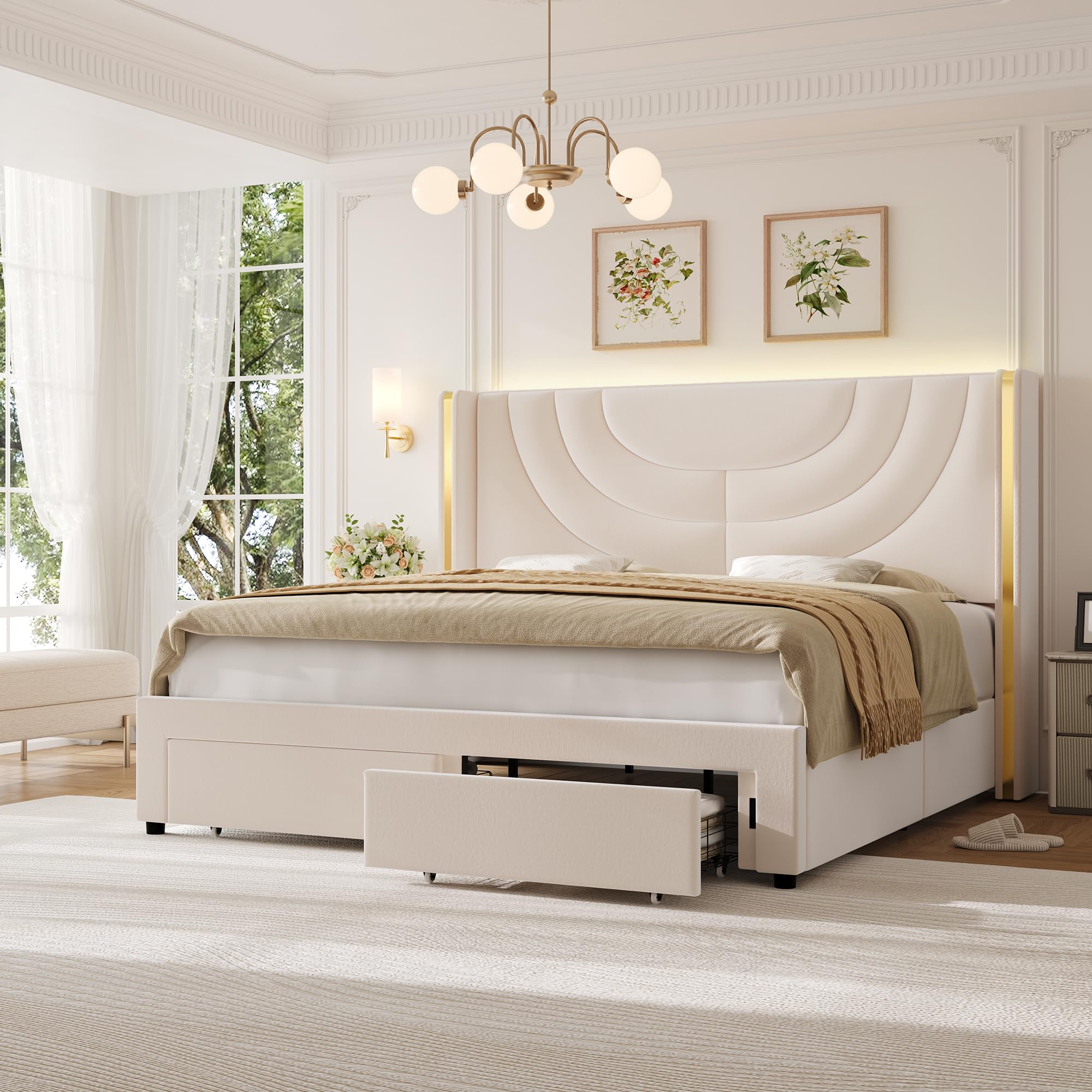 The HITHOS King Upholstered LED Bed Frame combines modern velvet upholstery with a wingback headboard and stainless steel accents for a stylish centerpiece. It features built-in RGB LED lighting controllable via remote or app, two large under-bed storage drawers, and a sturdy solid wood slat system that eliminates the need for a box spring. Designed for easy assembly and silent operation, this bed supports up to 1000 pounds and offers a perfect blend of luxury, practicality, and tech-savvy ambiance for the contemporary bedroom.