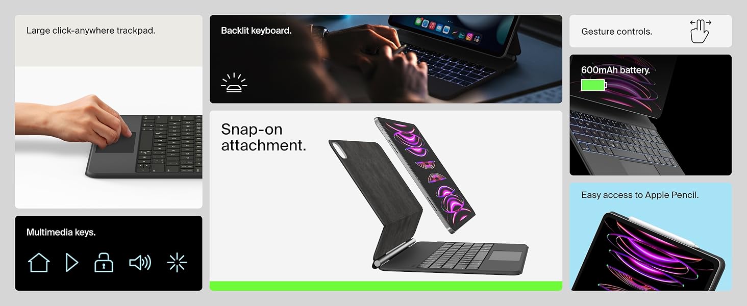The Belkin Pro iPad Keyboard Case combines a backlit Bluetooth keyboard with a large ergonomic trackpad and magnetic Apple Pencil storage, designed specifically for iPad Air M2 13" and iPad Pro 12.9". Featuring multi-gesture controls, dedicated multimedia keys, and a slim premium leather case, it enhances productivity on the go with a 600mAh battery and a 2-year warranty.