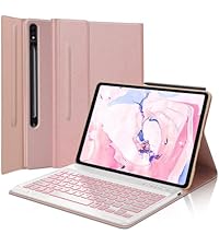 This premium Samsung Galaxy Tab keyboard case fits 12.4-inch S8+, S7 FE, and S7 Plus models, featuring a detachable Bluetooth keyboard with customizable backlighting, 3 adjustable viewing angles, and a built-in S Pen holder. Crafted from soft PU leather with reinforced corners, it offers durable protection and smart auto sleep/wake functionality, delivering over 70 hours of continuous keyboard use on a single charge. Designed for professionals and creatives seeking a sleek, versatile productivity boost in rose gold elegance.